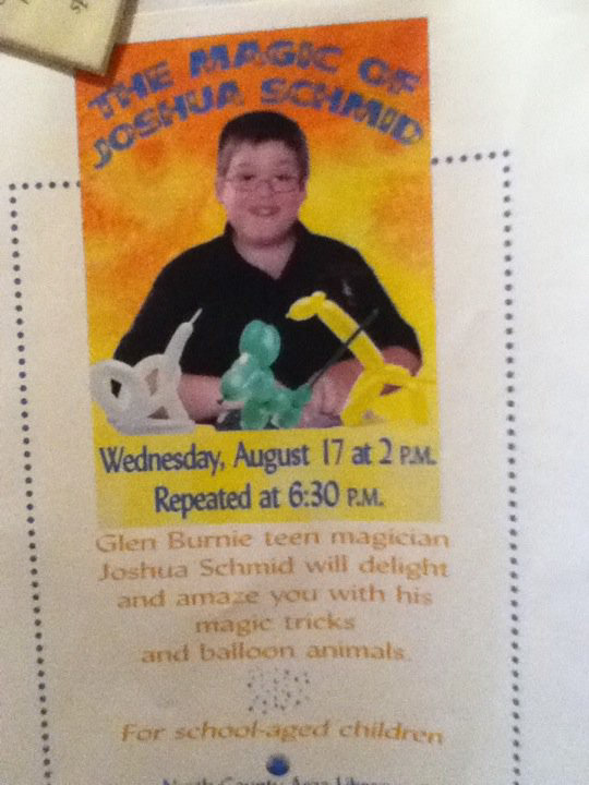 Josh also performs for free at the Baltimore Washington Medical Center, as well as an occasional church function or fundraiser. He wears his custom-made ballcap and T-shirt, often with the Indiana Jones soundtrack playing behind to build suspense. Though Josh takes his craft seriously, many underestimate his talent because of his age. “When we first started going to the hospital, nobody expected him to be any good,” said Josh’s father, John. “And at the end, the staff was all trying to peek in the room.”